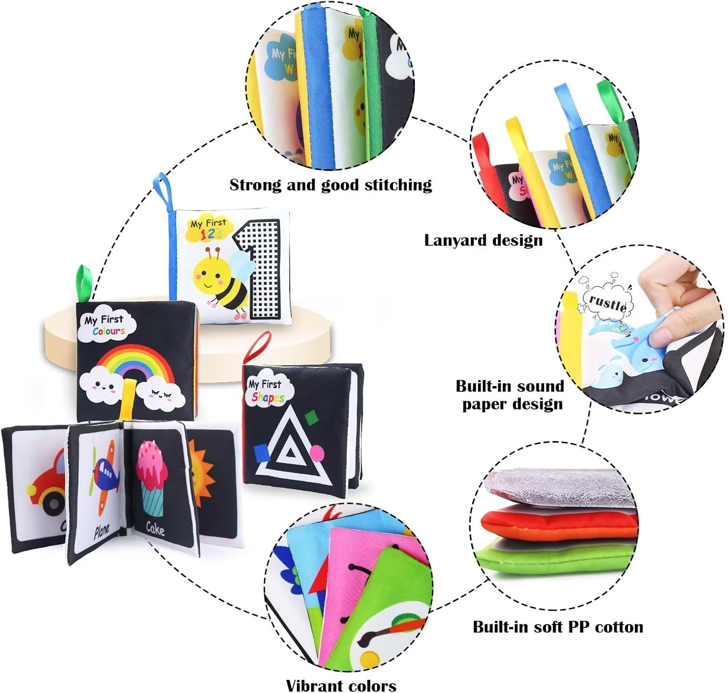 - Perfect Gift: These colorful cloth books have lovely patterns, which is bursting with sound and texture. It is beneficial to develop babies’ sensory awareness, visual-recognition skills, categorization skills, language & reading skills etc. It is a perfect gift, a delight kid activity book set.